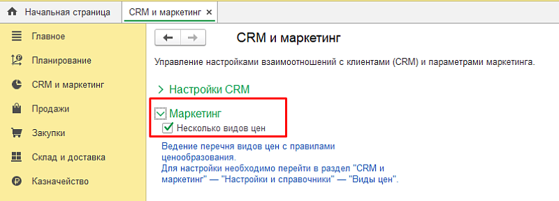 Использовать возможность установки нескольких видов цен можно после включения этой функции в настройках базы. Перейдите «НСИ и администрирование» — «Настройка НСИ и разделов» — «CRM и маркетинг» — «Маркетинг» — «Несколько видов цен».
