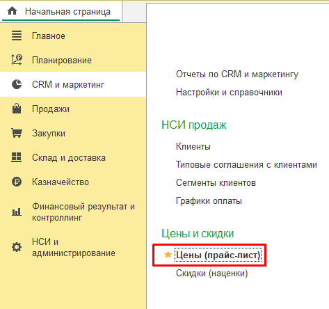 - Для создания новых и актуализации текущих цен нужно открыть «CRM и маркетинг» — «Цены и скидки» — «Цены (прайс-лист)».