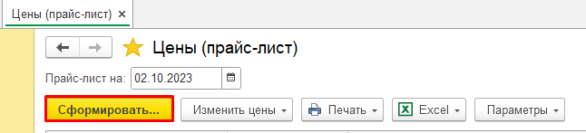 - Используем команду «Сформировать», чтобы заполнить список товаров с назначением цены.