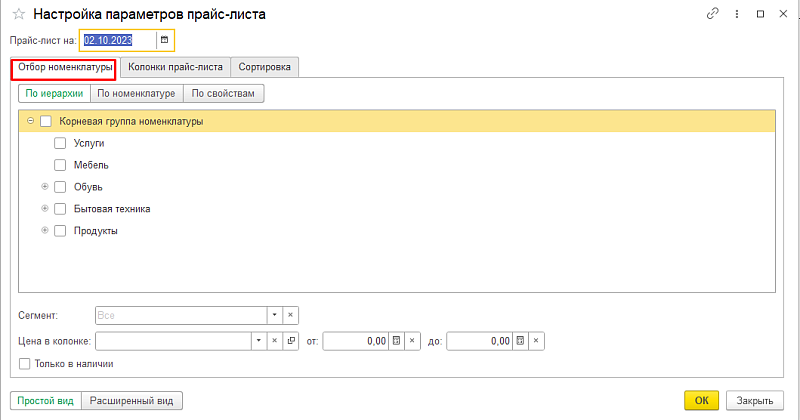 - В появившемся диалоговом окне выбираем закладку «Отбор номенклатуры» и устанавливаем параметры. Если параметры отбора не установлены, то будет заполнен весь список номенклатуры.