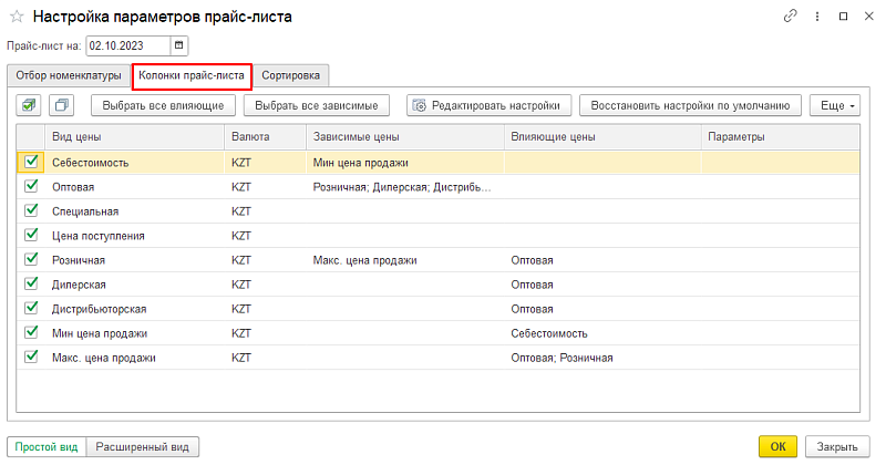 - Переходим к закладке «Колонки прайс-листа» и настраиваем список видов цен, которые нужно назначить.