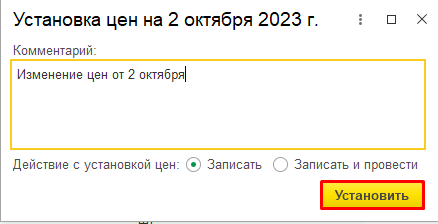 При выполнении этой команды будет автоматически создан документ «Установка цен номенклатуры», в котором будет указан список зарегистрированных цен.