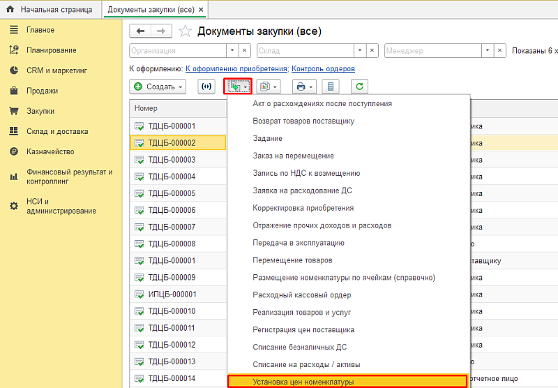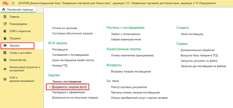 - Откройте раздел «Закупки» и выберите «Документы закупки (все)».