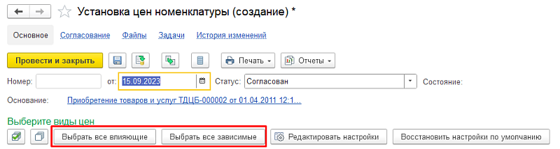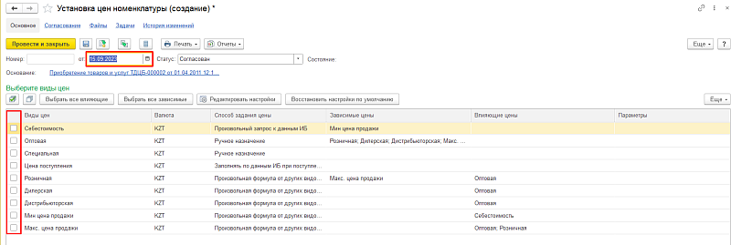 Выбрать тип цен можно вручную, либо воспользоваться кнопками «Выбрать все влияющие», «Выбрать все зависимые».
