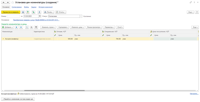 - После этого нажимаем «Провести и закрыть». Цены установлены.
