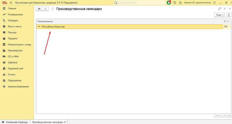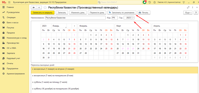 Производственных календарь, как правило заполняется в начале каждого года. По умолчанию, при выпуске обновленного релиза, обновляется и календарь. В календаре проставляются праздники и выходные. Согласно Законодательству РК, если праздничный день выпадает на выходной день, то праздник переносится на следующий рабочий день. Эти переносы, бухгалтер должен заполнить в календаре самостоятельно.
