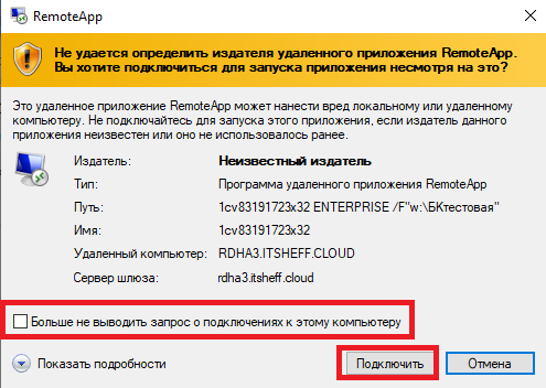 Также может появиться информационное окно подтверждения действий. Рекомендуется отметить галочку «Больше не спрашивать при удаленных подключениях от этого издателя» и затем нажать кнопку «Подключить».
