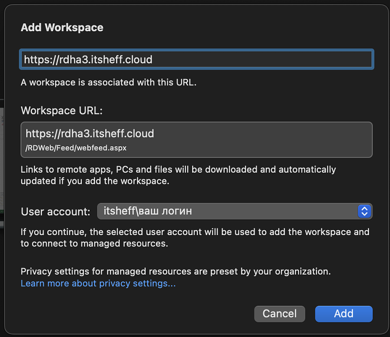 - Следующим шагом, в выпадающем меню выбираем Add User Account… Это необходимо для того, чтобы не вводить учетные данные для входа в облако каждый раз при входе.