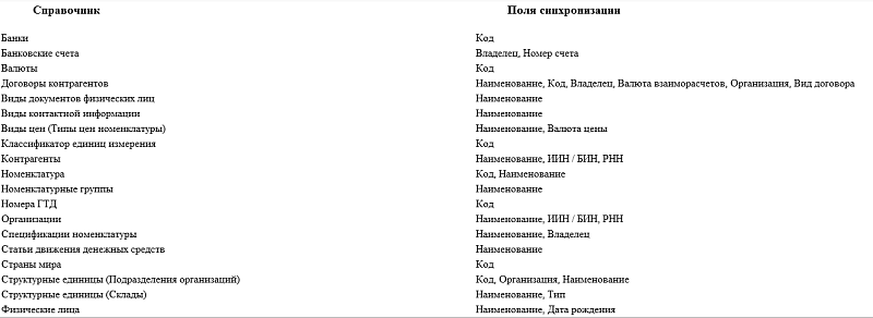 При первоначальной синхронизации данных идентификация данных справочников производится по коду или наименованию справочника. В некоторых справочниках производится идентификация по определенным полям, например, по ИИН/БИН и РНН в справочниках «Организации» и «Контрагенты». В таблице показан порядок синхронизации основных справочников.