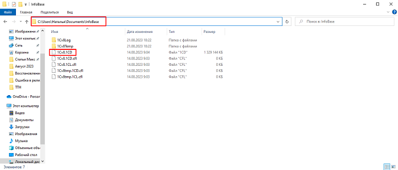 - Находите файл базы в формате *.1CD. По умолчанию он хранится в папке: C:\Users\Имя Пользователя\Documents\InfoBase.
