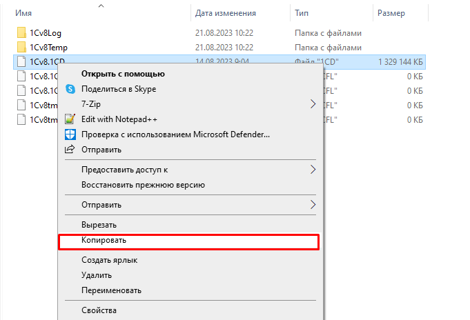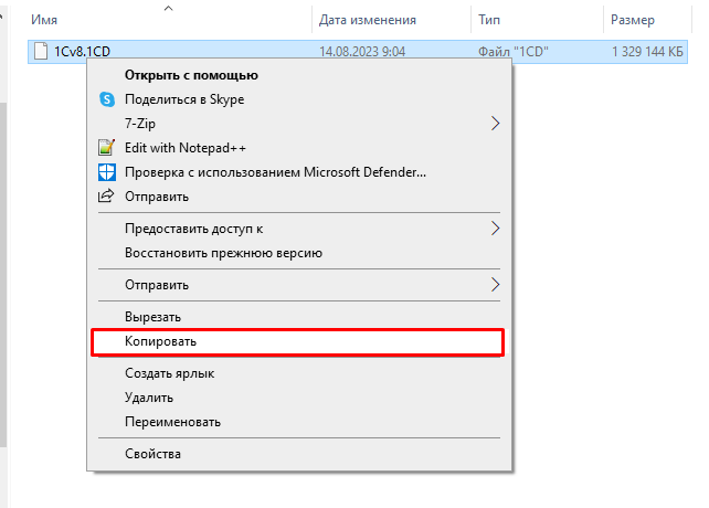 - Найдите файл архивной базы в формате *.1CD. Выберите его мышкой и используйте комбинацию клавиш Ctrl + C, либо щелкнете правой кнопкой и во всплывшем меню выберите «Копировать».
