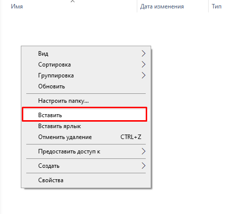 - Выбираете папку для хранения и переносите файл туда. Либо комбинацией клавиш Ctrl + V, либо щелкаете правой кнопкой по свободному месту и выбираете пункт «Вставить».