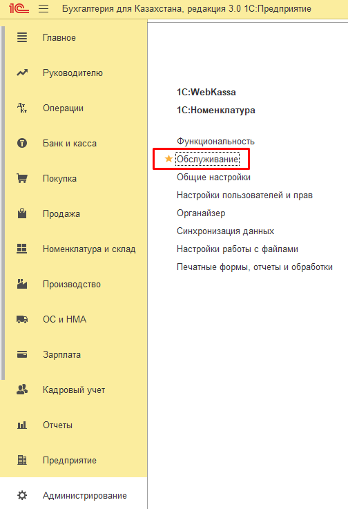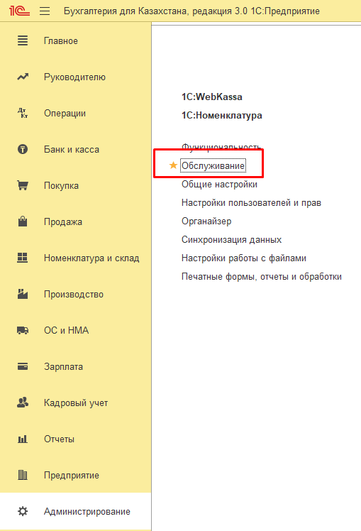 - В 1С выберите «Администрирование» — «Обслуживание».