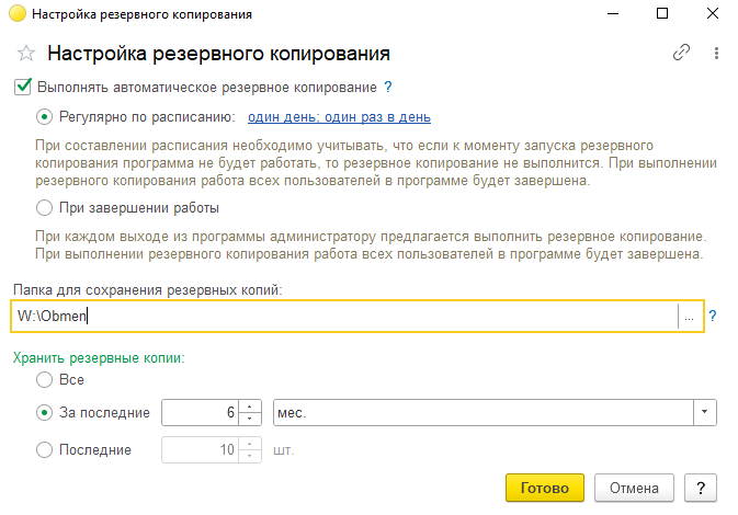 ❗Обратите внимание — такой способ настройки автоматического резервного копирования подойдет только для файловых баз 1С. Если вы используете 1С в клиент-серверном режиме, то автоматические бекапы баз выполняются через СУБД. И лучше, если этим будут заниматься специалисты.
