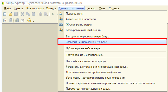 - Выберите «Администрирование» — «Загрузить информационную базу».