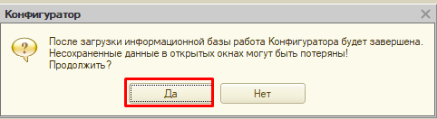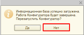 - После загрузки 1С предложит перезапустить Конфигуратор. Если ничего больше менять не собираетесь, то откажитесь и запускайте информационную базу.