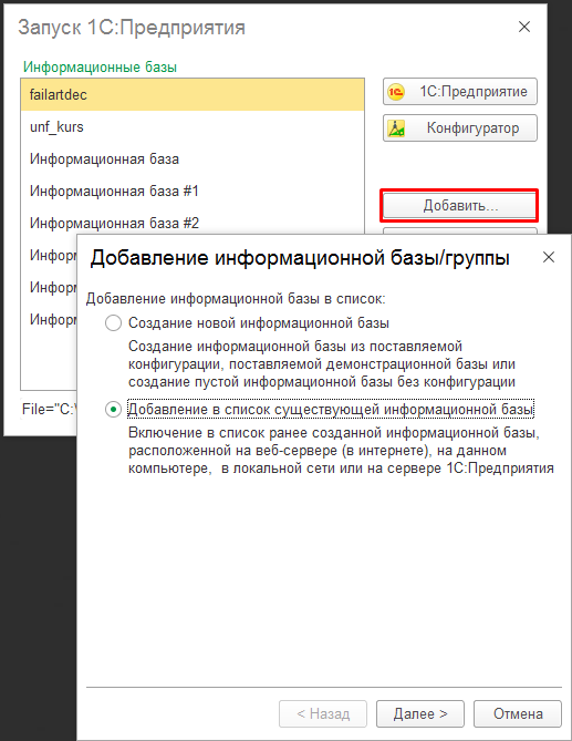 Способ № 1. Восстановление бекапа базы с помощью Конфигуратора