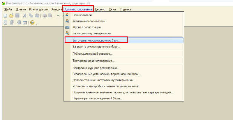 - Далее рекомендуем в окне «Администрирование» сначала сделать выгрузку текущей поврежденной базы.