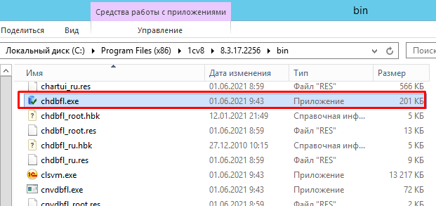 - Для запуска утилиты зайдите в папку 1С на компьютере. Обычно путь к ней выглядит так: C:\Program Files (x86)\1cv8\номер версии 1С\bin. Найдите в папке файл chdbfl.exe и запустите его.